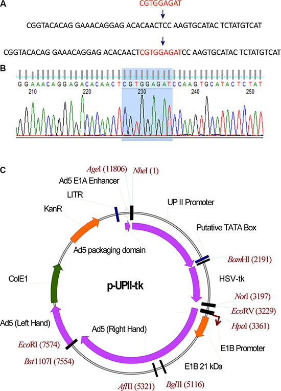 Figure 1: Modification and Identification of RGDAd-UPII-TK. (A) Schematic insertion of the RGD sequence into an adenoviral plasmid at the indicated site. (B) Sequencing results of the constructed plasmid. The shadow region shows the correct insertion of RGD sequence into pAdEasy-1. (C) Schematic construction of adenovirus shuttle plasmid. The plasmid profile shows the location of the UPII promoter and the HSV-TK gene.