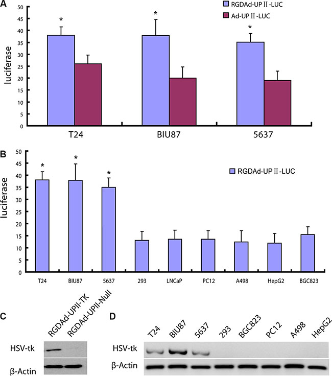 Figure 2: Analysis of HSV-TK gene expression with modified Adenovirus. (A) Luciferase expression levels of T24 that were infected with RGDAd-UPII-Luc and Ad-UPII-Luc. Luc activities were measured after the infection for 24 hours. The data are presented as the mean±SD of at least 3 independent experiments. * indicates statistical significance (*P < 0.05). (B) Luciferase expression levels of the indicated cell lines infected with RGDAd-UPII-Luc. (C) HSV-TK expression in adenovirus infected bladder cancer cells. T24 cells transfected with RGDAd-UPII-TK or RGDAd-UPII-Null were analyzed by Western blot for HSV-TK. β-actin was used as a loading control. (D) Western blot analysis of HSV-TK protein expression in bladder cancer cell lines and non-bladder cancer cell lines. The cells were collected and lysed 24 hours after the infection.