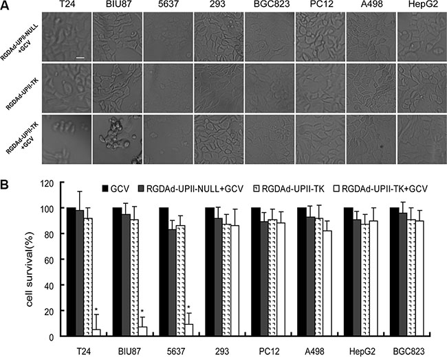 Figure 3: RGDAd-UPII-TK in combination with GCV treatment can eliminate bladder cancer cells efficiently in vitro. (A) Cell quantities and morphology changes after infection with RGDAd-UPII-TK or RGDAd-UPII-Null in combination with GCV treatment. Scale bar, 10 μm. (B) Cell viabilities were examined by MTT assay with three replicates for each condition. The relative cell viability is shown as a ratio relative to the GCV-treated control, and all data are presented as the mean + S.D. * indicates statistical significance (*P < 0.05).