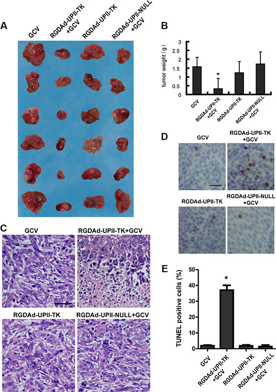Figure 4: The effect of RGDAd-UPII-TK infection on T24 implanted tumors in nude mice. (A) Photograph of subcutaneously implanted tumors excised from the nude mice. The tumor sizes in each group were compared. (B) The tumor weights in each group were measured and compared. (C) H&E staining of the implanted tumors after the indicated treatment. Scale bar, 50 μm. (D) Images of TUNEL staining of the excised tumor tissues showing the apoptotic cells. The cells were counterstained with hematoxylin. Scale bar, 50 μm. E. Statistical results of TUNEL-positive cells per field. All data are presented as the mean + S.D. * indicates statistical significance (*P < 0.05).