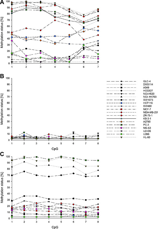 In none of the 19 cancer cell lines the average methylation status of the ABCC1 promoter (across the eight CpGs investigated) was found to be ≥ 5% (Figure 3B). Moreover, the average methylation status of the ABCG2 promoter (across the eight CpGs in the sequence to analyze) was even < LOQ in five cancer cell lines (A2780, KB-3-1, MDA-MB-231, HCT116 and U266) (Figure 3C). In four cell lines (PC-3, NCI-H1703, SW1573 and HL-60), the eight CpGs were highly methylated (methylation status ranging from 70 to 97%). In the remaining ten cell lines, the average methylation status was between 5 and 32%.