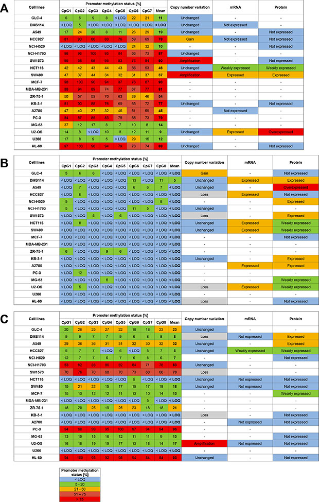 Figure 4: Association of promoter methylation status, copy number variation and expression of ABCB1 (A), ABCC1 (B) and ABCG2 (C) in cancer cell lines. Limit of quantification (LOQ): 5%. “-“ not determined.