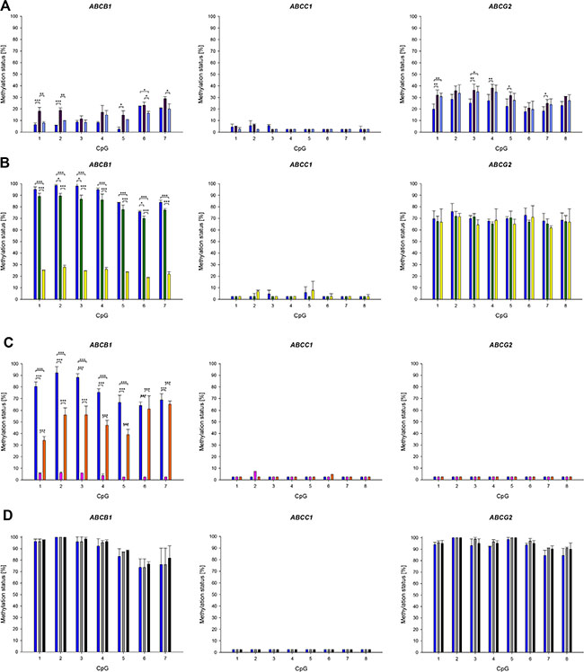 Figure 5: Promoter methylation patterns of ABCB1, ABCC1 and ABCG2 in parental cell lines and their drug-resistant sublines. (A) GLC-4 (dark blue), GLC-4/adr (purple) and GLC-4/rev (light blue). (B) SW1573 (dark blue), SW1573/2R120 (green) and SW1573/2R160 (yellow). (C) KB-3-1 (dark blue), KB-C-1 (pink) and KB-1089 (orange). (D) HL-60 (dark blue), HL-60/adr (grey) and HL-60/vinc (black). Mean and standard deviation of at least four technical replicates. *p < 0.05, **p ≤ 0.01, ***p ≤ 0.001.