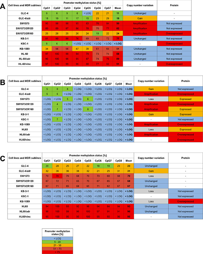 Figure 6: Association of promoter methylation status, copy number variation and expression of ABCB1 (A), ABCC1 (B) and ABCG2 (C) in MDR cell models. Limit of quantification (LOQ): 5%. “-“ not determined.