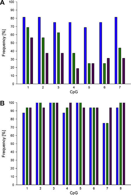 Figure 7: Frequency of promoter methylation of ABCB1 (A) and ABCG2 (B) in breast cancer patients. Blue: tumor tissue, green: tumor-adjacent tissue, purple: tumor-distant tissue. Limit of quantification (LOQ): 5%.