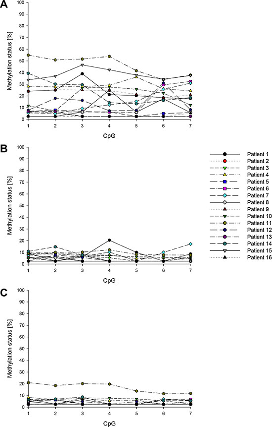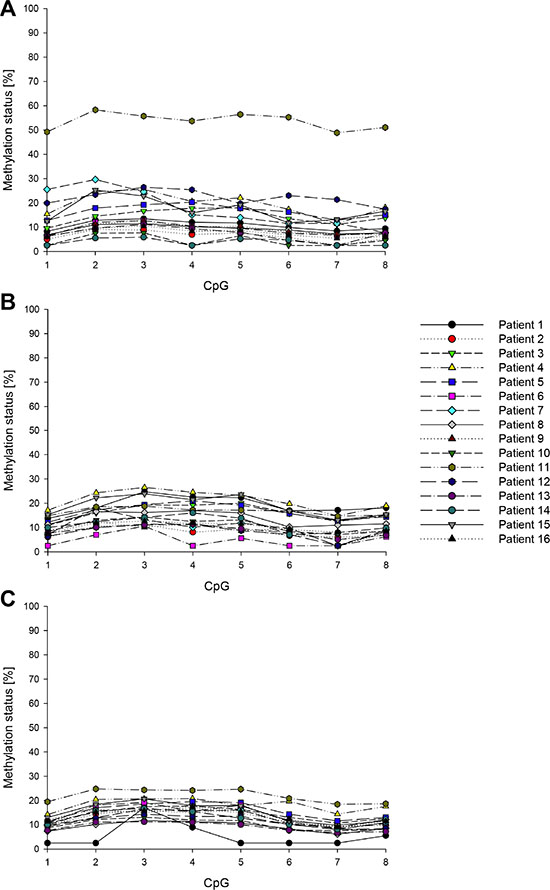 Figure 9: Promoter methylation status of ABCG2 in breast cancer patients. (A) Tumor tissue, (B) tumor-adjacent tissue, (C) tumor-distant tissue. Mean values of at least two technical replicates.