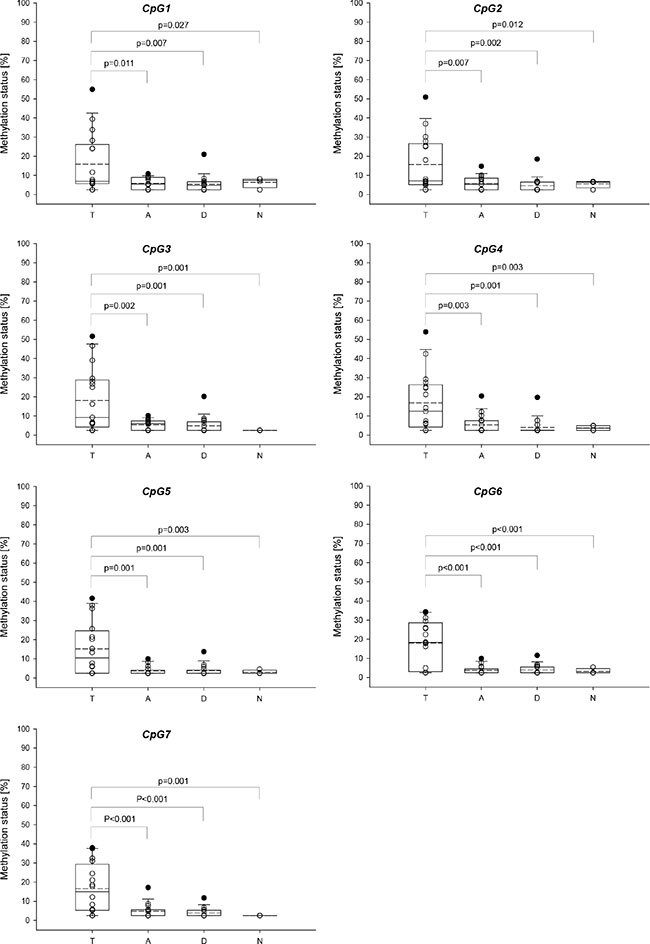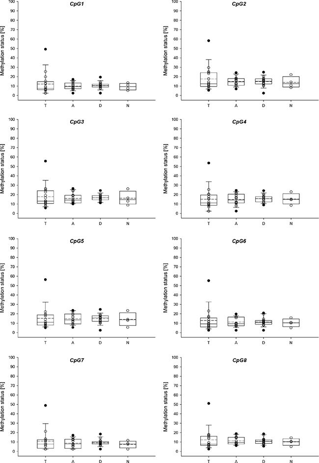 Figure 10: Distribution of the promoter methylation status of ABCB1 in breast cancer patients and healthy controls. T: Tumor tissue, A: tumor-adjacent tissue, D: tumor-distant tissue, N: normal breast tissue. Straight line: median, dashed line: arithmetic mean.