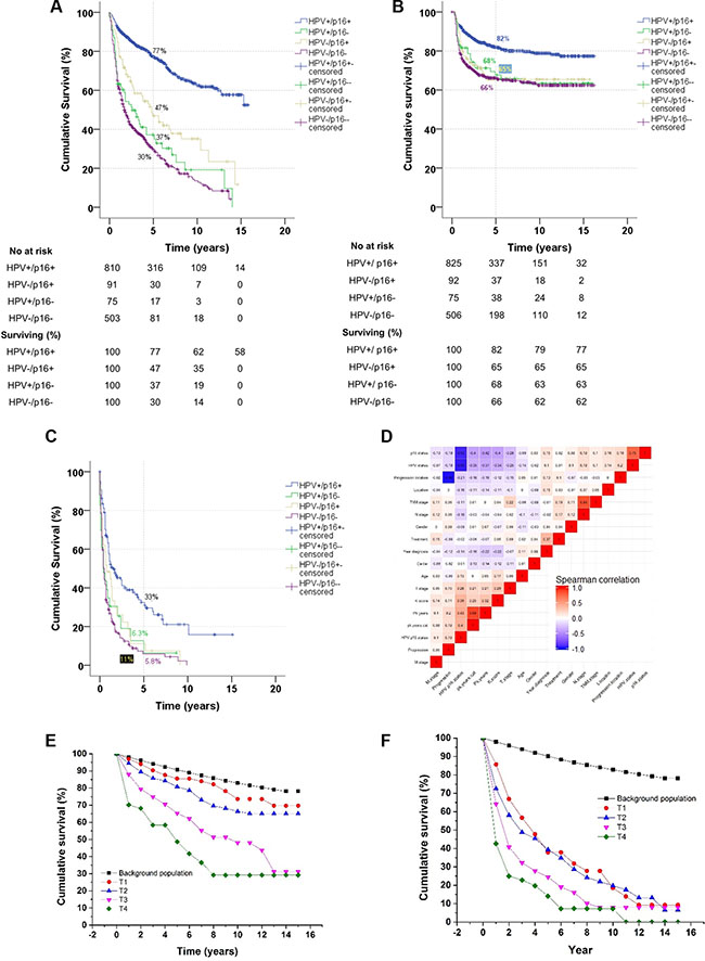 Figure 1: Kaplan-Meier curves for (A) overall survival, (B) time to progression, and (C) survival after progression. Correlation heatmap between variables (D). Comparison between survival in an age- and gender-matched background population and the HPV+/p16+ subgroup (E) and the HPV-/p16- subgroup (F) based on T classification of tumours.