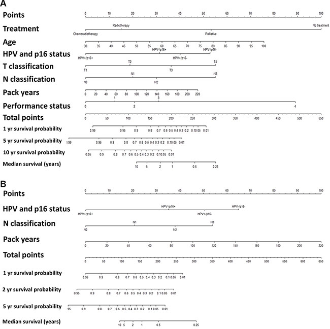 This study included the largest-to-date collection of 1,542 OPSCCs from a consecutive, population-based, non-selected cohort and assessed OS, TTP, and SAP as well as their relation to multiple clinico-pathological characteristics. From these results, we constructed and internally validated nomograms to predict OS and TTP. Furthermore, we established a simplified prognostic index based on the independent covariates for OS for use in categorizing patients into low-, intermediate-, and high-risk groups. Besides being useful for interpretation of the underlying Cox model, the nomogram combines independent prognostic factors and considers the importance of each on the probability of survival and progression. The prognostic models we present may facilitate discussions in clinical settings and aid in identifying low-risk patients that could be candidates for de-escalation therapy, as well as high-risk patients eligible for new clinical trials. In particular, HPV+/p16+ patients with T1-T2 tumours should be considered candidates for de-escalation therapy, as we demonstrated their survival is similar to the background population, and this would avoid the morbidity associated with therapy. Notably, at least nine de-escalation treatment trials are on-going or finishing [18]. Our nomograms are likely to be applicable to these and future trials, as we reported similar 5-year survival or progression rates as studies in North America;[19–21] Western [22–24], Southern [25], and Northern Europe [6, 26]; Australia [27]; and China [28].