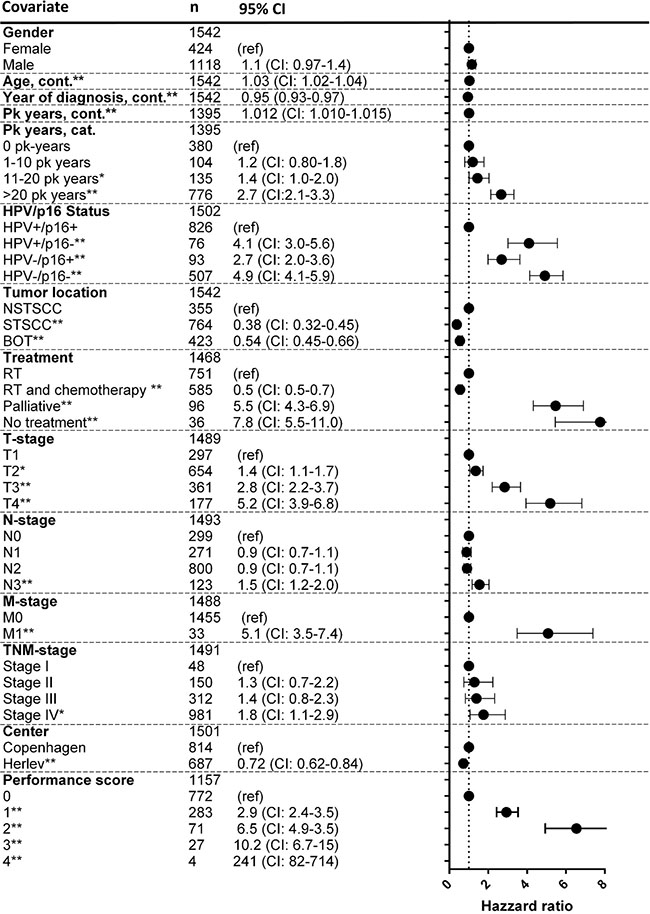 A total of 1,542 patients diagnosed with OPSCC between 2000–2014 were included, and their characteristics are summarized in Table 1 with univariate hazard ratios for OS. The majority of patients were males (72%), with a median age of 60 years at diagnosis, and typically presented with tumours in an advanced nodal stage, but with small primary tumours (Table 1). Of the total cohort, 54% were stage III or IV, 61% had T1 or T2 primary tumours, and 60% had N2 or N3 nodal classification (Table 1). The median follow-up for patients alive at the last date of follow-up was 4.0 years (range, 0.8 to 15.8 years). Tobacco use was high with a median number of pack-years of 27 (mean 30). Subsequently, we examined which of the variables were correlated (Figure 1D). It was observed that the subgroup of patients with an HPV+/p16+ tumour correlated with: a shorter smoking history, higher N-stage, better performance status, lower T-stage, and younger age (Figure 1D).