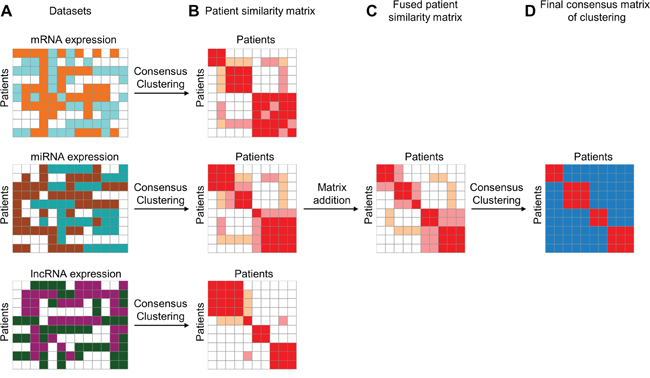 Figure 1: Illustrative steps of Integrated Consensus Clustering. A. Three matrixes represent mRNA, miRNA and lncRNA expression profiles, respectively, for the same cohort of patients. B. Patient similarity matrixes are represented by the consensus matrix produced using consensus clustering algorithm for each data type independently. C. Fused patient similarity matrix is generated by matrix summation of three patient similarity matrixes derived from three different datasets. D. Final consensus matrix is produced by using consensus clustering on fused patient similarity matrix. The final consensus matrix can be used for evaluating clustering stability of ICC.