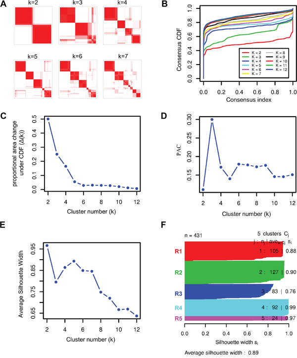 Figure 2: Identification of stable clusters of clear cell Renal Cell Carcinoma by using ICC. A. Consensus matrixes of 431 TCGA ccRCC samples for each k (k=2 to 7), displaying the clustering stability using 1000 iterations of hierarchical clustering. B. Plot of cumulative distribution function (CDF) from consensus matrix for each k (k= 2 to 12). C. The Δ(k) vs k plot, indicating the optimal cluster number is k=5 where the ‘elbow’ occurs. D. Proportion of Ambiguous Clustering (PAC) vs k plot, allowing inference of the optimal k by the lowest PAC, that is 2 or 5. E. Average silhouette width vs k plot, showing the optimal cluster number k= 5 with respect to the major increase from k=3 to k=5 and the subsequent drop-off. F. Silhouette width profile calculated from the consensus matrix when k=5, which was selected as the optimal k.
