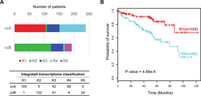 Figure 3: Prognostic value of integrated transcriptomic classification compared with ccA/ccB classification. A. Overlap between our integrated transcriptomic classification and ccA/ccB clusters. The bottom panel shows the detailed crosstab table. B. Kaplan-Meier plot showing that clusters R1 and R4 can effectively separate the samples in ccA cluster in terms of overall survival (R1(n=104) vs R4 (n=88), log-rank test P = 4.68e-4).
