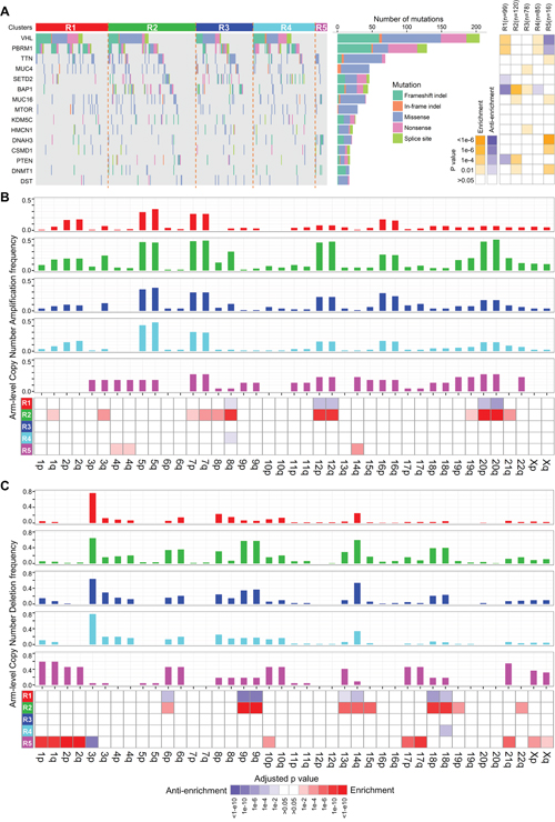Figure 4: Distributions of somatic genomic alteration in five clusters identified by ICC. A. Distributions of non-silent mutations of the top 15 most frequently mutated genes in ccRCC. The right panel represents significance of enrichment or anti-enrichment (one-sided Fisher’s exact test) of non-silent mutation events for each gene within any particular cluster versus the other clusters. B, C. Distributions of arm-level copy number alterations (CNA), including amplification (B) and deletion (C), in five clusters. Bar plots of frequency of CNA in five clusters are on the top five panels. The bottom panel shows significance of enrichment or anti-enrichment (one-sided Fisher’s exact test) of CNA events for each chromosome arms within any particular cluster versus the other clusters.