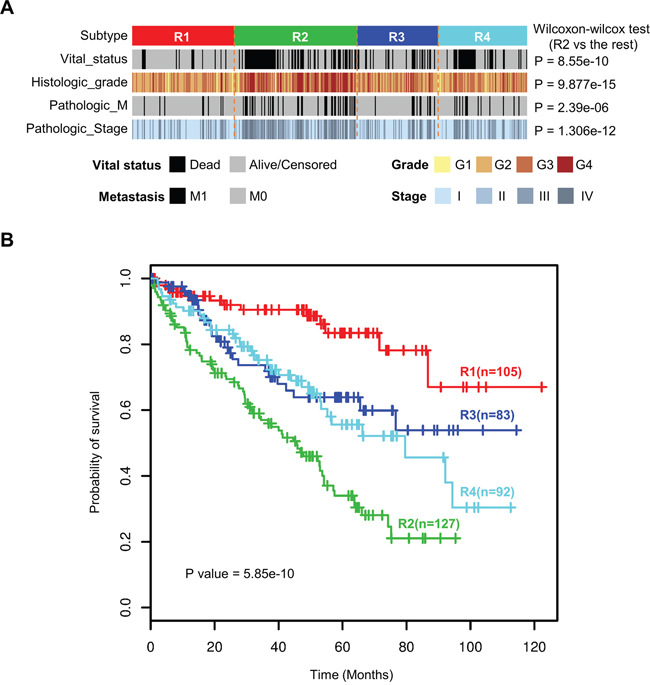 We surveyed clinicopathological characteristics of four ccRCC subtypes (Table 1). Subtype R2 is enriched for more distant metastasis and higher histologic grade and pathologic stage, suggesting more aggressive behaviors of tumors in R2 (Figure 5A). Overall survival analysis reveals significantly different survival outcomes among the four integrated transcriptomic subtypes (Figure 5B). Furthermore, multivariate analysis demonstrates that our four integrated transcriptomic subtypes are independent prognostic factors after adjusting for clinical indices including gender, age, pathologic stage and histologic grade (Table 2).