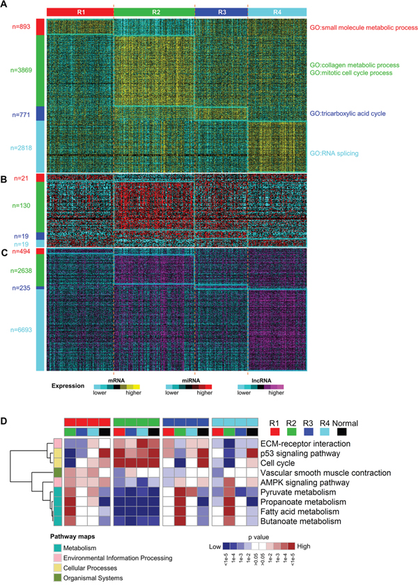 RNAs with subtype-specific expression may play important functions in individual molecular subtypes. So we identified the mRNAs, miRNAs and lncRNAs with significantly high expression (fold change > 1.5 and adjusted p value < 0.05) among four integrated transcriptomic subtypes by comparing each subtype with the rest using a moderated t-test [28] (Figure 6A–6C). Interestingly, the numbers of subtype-specific highly expressed mRNAs and lncRNAs in R2 and R4 are much larger than those in R1 and R3, implying that tumors in R2 and R4 are more active at transcriptomic level. In addition, highly expressed miRNAs in R2 are far more than those in other subtypes and highly expressed lncRNAs in R4 account for more than half (6693/12727=52.6%) of all the lncRNAs evaluated in this study. These results suggest that non-coding RNAs are important in ccRCC subtyping and that miRNAs and lncRNAs may play critical roles in R2 and R4, respectively.
