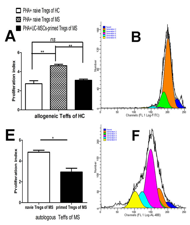 Some scientists suggest that Teffs resistance to the regulation of Tregs may also contribute to the pathogenesis of MS [35]. We did not examine whether there is a resistance of Teffs to Tregs in our current studies. However, our data showed that UC-MSC-primed Tregs from MS patients efficiently suppressed the proliferation of autologous Teffs stimulated by PHA compared to non-UC-MSC-primed Tregs from the same MS patients (Figure 2E).