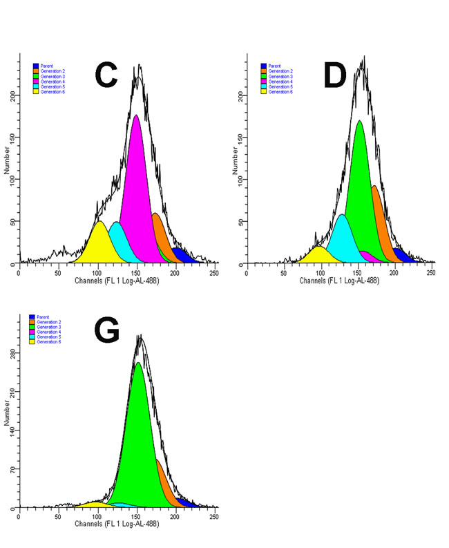 Figure 2: UC-MSCs reversed the impaired suppressive function of Tregs from MS. A. Bar graph showing that Tregs purified from naïve PBMCs (without UCMSC-priming) of MS patients failed to reduce the proliferation of allogeneic Teffs from healthy controls while Tregs purified from UCMSC-primed PBMCs of the same MS significantly reduced the proliferation index of allogeneic Teffs from healthy donors. No significant difference in the proliferation index of allogeneic Teffs was detected in Tregs purified from UCMSC-modulated PBMCs of MS and Tregs purified from naïve PBMCs of HC, suggesting that UC-MSC-priming may have reversed the functional deficits of Tregs from MS in the co-culture. Tregs:Teffs =1:10. **p<0.01, *p<0.05. B, C, & D. Representative ModFit results of CFSE-labeled and PHA-stimulated allogeneic CD4+CD25- Teffs of healthy donors in co-cultures with (B) Tregs sorted from naïve PBMCs of healthy donors, (C) Tregs sorted from naïve PBMCs of MS patients, and (D) Tregs sorted from UC-MSC-primed PBMCs of the same MS patients at a constant ratio of 1:10 for Tregs:Teffs. E. Bar graph showing that Tregs purified from UC-MSC-primed PBMCs of MS patients significantly reduced the proliferation index of autologous Teffs compared to Tregs purified from naïve PBMCs of the same MS patients. **p<0.01. F & G. Representative ModFit results of CFSE-labeled and PHA-stimulated autologous CD4+CD25- Teffs in co-cultures with (F) Tregs purified from naïve PBMCs of MS patients and (G) Tregs purified from UC-MSC-primed PBMCs of the same MS patients at a ratio of 1:10 for Tregs:Teffs