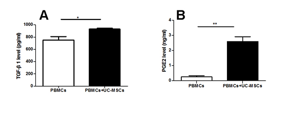 Cell-free supernatant was collected after co-culture of PBMCs with UC-MSCs (1:5) and cultures of PBMCs without UC-MSCs for 3 days and used to measure the concentrations of cytokine prostaglandin E2 (PGE2), transforming growth factor (TGF)-β1, interleukin-10 (IL-10), and interferon (IFN)-γ by ELISA analysis according to the manufacturer’s protocol. Cell-free supernatant collected after Tregs and Teffs (1:10) co-cultures for 3 days were used to measure the concentration of cytokine IL-10 by ELISA analysis according to the manufacturer’s protocol. TGF-β1, IL-10, and IFN-γ ELISA kits were purchased from eBioscience (San Diego, CA), and the PGE2 ELISA kit was purchased from R&D System (Minneapolis, CA). The collected cell-free supernatant was placed in a 96-well specific antibody-coated plate. Absorbance was recorded at 450 nm using a microplate reader (Bio-Rad, Philadelphia, PA). Each cytokine standard and sample was run in duplicate.