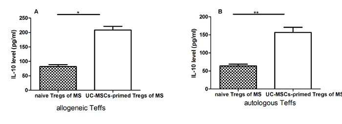 Figure 4: UC-MSC-primed Tregs from MS patients significantly increased IL-10 secretion levels in co-cultures with allogeneic Teffs from healthy donors or autologous Teffs from MS patients. A & B: Bar graph showing that UC-MSC-primed Tregs from MS patients significantly increased IL-10 secretion levels in co-cultures with allogeneic Teffs (A) from healthy donors or autologous Teffs (B) from MS patients compared with naïve Tregs (without UC-MSC priming) from the same MS patients. Each experiment was performed in triplicate. Data were presented as mean ± SD of four independent experiments. *p<0.05, **p<0.01.