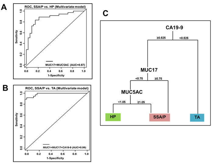 Figure 3: Combined performance of mucins and associated O-glycans for discriminating colorectal polyp subtypes. The combined utility of significantly altered mucins and O-glycans as markers for differential identification of polyp subtypes was evaluated utilizing multivariate regression models in conjunction with ROC curve based analysis. A. ROC curves representing diagnostic potential of combinatorial panels of mucins and associated O-glycans for differentiating SSA/P from HP. MUC17+MUC5AC combination differentiated SSA/P from HP with the AUC of 0.87. The model has 83% accuracy (60/72) in predicting SSA/P vs. HP. B. MUC1 and MUC17+CA19-9 combination differentiated SSA/P from TA with the AUC of 0.99. the model has 95% accuracy (71/75) in predicting SSA/P vs. TA. C. Decision tree based model to accurately define the combined diagnostic efficacy of mucins and associated O-glycans for polyp stratification. The panel of three markers CA19-9/MUC17/MUC5AC differentiated precancerous polyps (SSA/P and TA) from benign polyps (HP). Polyp sections having H-Score < 0.525 for CA19-9 predicts the presence of TA. For tissues sections having H-Score ≥ 0.525 for CA19-9, and H-score ≥ 0.75 for transmembrane mucin MUC17 the lesion is likely to be SSA/P. In cases where MUC17 H-score is < 0.75, and MUC5AC H-score is ≥ 1.05, then SSA/P is predicted and if MUC5AC H-score < 1.05, then HP is predicted. The tree based model has 79% accuracy (85/108) in predicting all 3 groups simultaneously.HP: hyperplastic polyps; SSA/P: sessile serrated adenoma/polyps; TA: tubular adenoma.