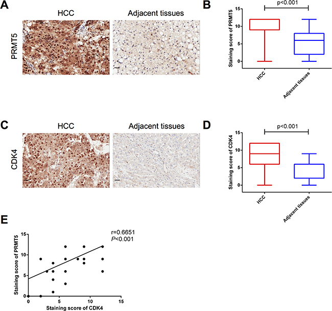 Figure 1: Protein levels of PRMT5 and CDK4 are positively correlated. A, C. Representative histopathologic sections of human HCC and adjacent tissues were stained with PRMT5 (A) and CDK4 (C) antibodies (Scale bar, 20 μm). B, D. Semi-quantitative immunohistochemical analysis of 75 human HCC and adjacent tissues for PRMT5 (B) and CDK4 (D). The experiments were tested with paired t-test. E. Pearson correlative analysis of semi-quantitative staining scores for PRMT5 and CDK4. The standard curve was drawn by linear regression of the correlation scores.