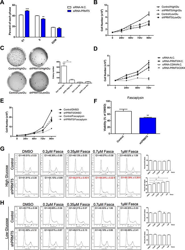 The relationship between PRMT5 and CDKs in previous studies have been identified in that PRMT5 plays a role in regulating symmetric dimethylation of histones through the interaction of methylosome protein 50 (MEP50) with CDK4 [21], CDK8 or CDK19 [30]. For example, the previous works have shown that CCND1/CDK4 phosphorylates the PRMT5 co-factor MEP50 and activates PRMT5 methyltransferase in CUL4 transcriptional suppression. Those observations suggest a critical oncogenic role of PRMT5 and CDK4 in tumorigenesis. Here, we provide considerable evidence of a positive role for PRMT5 and CDK4 in tumor cell cycle regulation. Our study clearly described the non-methyltransferase activity of PRMT5 by competitively preventing CDK4 from binding CDKN2A, thereby increasing the CDK4-RB-E2F transcriptional activity. Although we affirmed MEP50 interacted with CDK4, the interaction could not be significantly induced by glucose. That means glucose may promote the formation of PRMT5/MEP50-CDK4 complex, however, it mainly enhances the link of PRMT5-CDK4 not MEP50-CDK4 in a molecular level. Thus, our results support a supplemental function for CDK4-PRMT5 transcriptional repression in contributing to tumor growth.