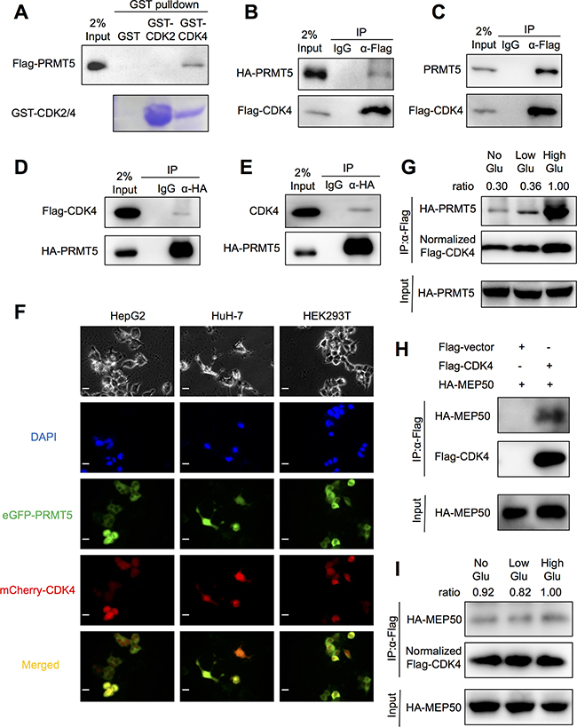 Figure 4: PRMT5 interaction with CDK4. A. GST-pull down assays between GST-fused CDK2/4 (or GST alone as control) and Flag-PRMT5 overexpressed in HKT293T cell lysates were performed. B, C, D, E. HEK293T cells were transfected with Flag-CDK4 or HA-PRMT5 (or both) for 48 h. The interaction between exogenous (or endogenous) PRMT5 and CDK4 was examined by co-immunoprecipitation assays followed by Western blot. F. HepG2, HuH-7 and HEK293T cells were co-transfected with eGFP-PRMT5 and mCherry-CDK4 for 48 h. The eGFP (green) and mCherry (red) signals were acquired by a fluorescence microscope at 40× magnification (Scale bar, 10 μm). G. HepG2 cells were co-transfected with HA-PRMT5 and Flag-CDK4 for 24 h in normal conditions and then cultured in no/low/high glucose media for 24h. The interaction was examined by co-immunoprecipitation assays followed by Western blot. H. HEK293T cells were transfected with Flag-CDK4 (or empty vector) and HA-MEP50 for 48 h. The interaction between exogenous MEP50 and CDK4 was examined by co-immunoprecipitation assays followed by Western blot. I. HepG2 cells were co-transfected with HA-MEP50 and Flag-CDK4 for 24 h in normal conditions and then cultured in no/low/high glucose media for 24h. The interaction was examined by co-IP assays followed by Western blot.