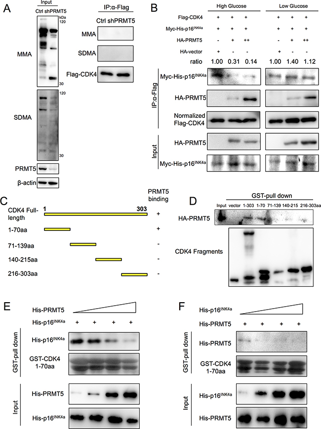 Figure 5: PRMT5 competitive inhibition of interaction between CDK4 and CDKN2A. A. Flag-CDK4 proteins in Control or shPRMT5 HepG2 cells were immunoprecipitated by anti-Flag M2 affinity gel, and the mono-methylated arginine (MMA) and symmetric dimethylated arginine (SDMA) levels of CDK4 were examined by Western blots. B. HEK293T cells were co-transfected with Flag-CDK4, Myc-6×His-p16INK4a and HA-PRMT5 (0.4 μg or 4 μg, with HA-empty vector as control) for 24 h and cultured in high/low glucose media for 24 h. Flag-CDK4 proteins were immunoprecipitated with an anti-Flag M2 affinity gel, and Myc-His-p16INK4a protein levels in the samples were examined by Western blot. C. Full-length CDK4 (NP_000066, NCBI) and its fragments used in this study. D. GST-pull down assays between GST-fused CDK4 fragments and HA-PRMT5 overexpressed in HEK293T cell lysates were performed. E, F. Binding reaction (500 μl) containing 100 μl purified His-p16INK4a (or His-PRMT5) and increasing amounts (50 μl, 100 μl, 200 μl, 400 μl) of purified His-PRMT5 (or His-p16INK4a) was incubated with GST-fused CDK4 1-70 aa. Protein levels of His-p16INK4a (or His-PRMT5) pulled down were examined by Western blot.