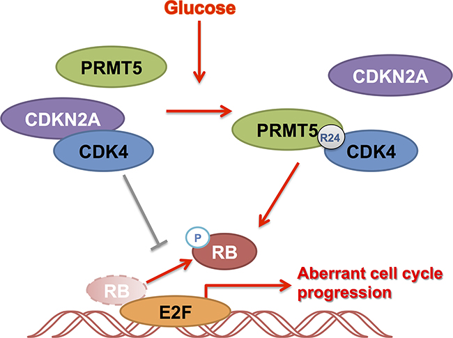 Commonly, PRMT5 contributes to tumorigenesis and cell cycle imbalance as an arginine methyltransferase. PRMT5 methylates arginine residues of histones or non-histones leading to transcriptional silencing, including the cell cycle regulators. For example, acting as a tumor suppressor, E2F1 methylated by PRMT5 can increase tumor cell growth and inhibit apoptosis [31]. However, E2F1 plays an accelerative role in cell cycle regulation of tumor growth, which is dependent on pRB and CDKs. Here, we provide evidence for PRMT5 functioning in a non-enzymatic manner. The competitive binding of CDK4-CDKN2A or PRMT5-CDK4 is alternatively decided by glucose induction. Thus, it turns the pRB-E2F1 pathway into a transcriptionally activated state or depressed state. The results suggest a crucial mechanism for PRMT5 in cell cycle regulation contributing to oncogenesis.