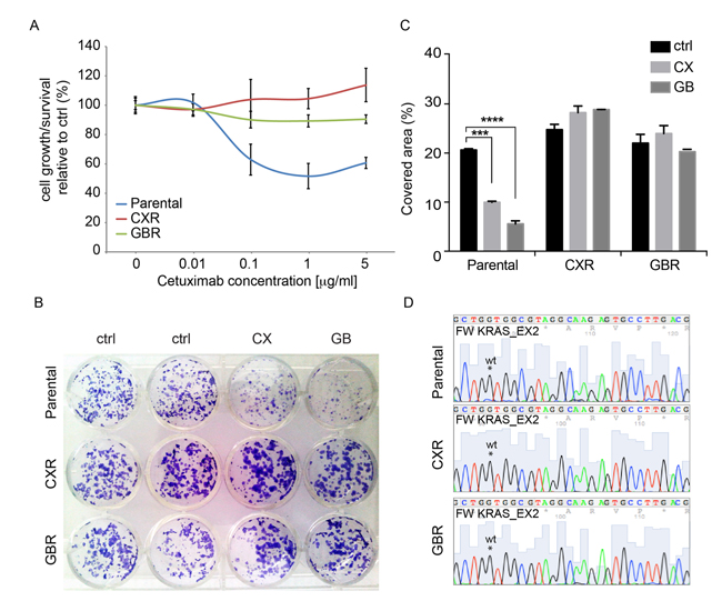 Figure 1: Establishment of colorectal cells resistant to cetuximab. Human colorectal cancer Caco-2 cells were made resistant to cetuximab (CX) and gefitinib (GB) by continuous exposure to increasing doses of drug and maintained with 2 μg/ml of CX and 1 μM of GB. A. Cell proliferation analysis by Alamar assay of parental, cetuximab-resistant (CXR) and gefitinib-resistant (GBR) cells following treatments with increasing concentration of cetuximab in medium containing 1% serum for 72h. The graphic represents the relative proliferation/viability of the cells following 72 hours of treatment related to control; B-C. Colony formation assay of parental, cetuximab-resistant (CXR) and gefitinib-resistant (GBR) cells. Cells were grown in absence or presence of CX (1μg/ml) and GB (1 μM) for 10 days in medium containing 1% of serum, then fixed, stained with Crystal Violet and photographed. Representative figures and quantification of the covered areas by ImageJ is provided in B and C, respectively. The statistic was calculated by 2-way ANOVA, *** P<0.0001, ** P<0.01. These experiments were repeated at least three times. D. Sequence analyses of KRAS Exon 2, showing the wild type sequence detected in parental, CXR and GBR cells.