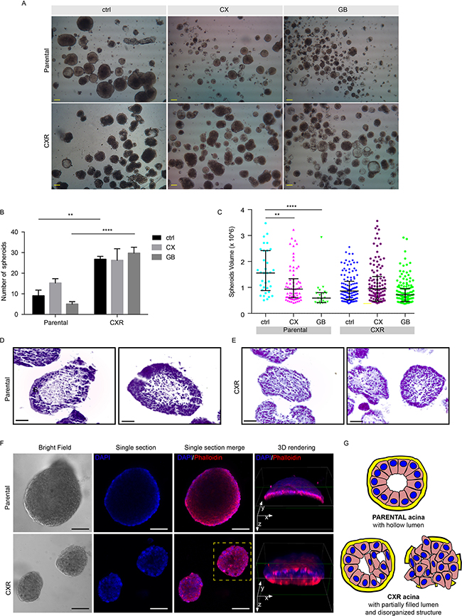 Figure 2: Cetuximab resistant cells displayed increased ability to growth in suspension as colonspheres. We investigated the morphology of Caco-2 parental, CXR and GBR cells when forced to grow in suspension. A. 4X magnification of Caco-2 producing “spheroid-like” structures, under the indicated treatments. Scale bar 100μm; B. Number of filled spheroids presented as average ± S.E.M. 2-way ANOVA with Bonferroni Test, ** p<0.01; ****p<0.0001; C. Quantification of spheroids sizes measurements under the indicated treatments in 5% FBS (EGF 10ng/ml, CX 1μg/ml and GB 1μM) is presented as dots plot. Each dot represents the quantification of a single spheroid (n= 117 for Parental cells, n=332 for CXR). Bar represents volume averages ± S.E.M, 1-way ANOVA, ** p<0.01; ****p<0.0001; D-E. Analysis of Caco-2 parental and CXR paraffin-embedded spheroid morphology by H&E staining. Scale bar 50 μm; F. Single section passing through the maximum diameter of spheroids and 3D confocal morphology of parental and CXR spheroids. Left panel: bright field imaging; central panels: DAPI and Phalloidin confocal microscopy; right panel: three-dimensional reconstructions of both signals, obtained by rotating the y axes and cutting the lower part of the spheroids (green lines) to observe the inner structures; scale bar 100 μm; G. Illustration depicting a schematic representation of the parental and CXR spheroid morphology.