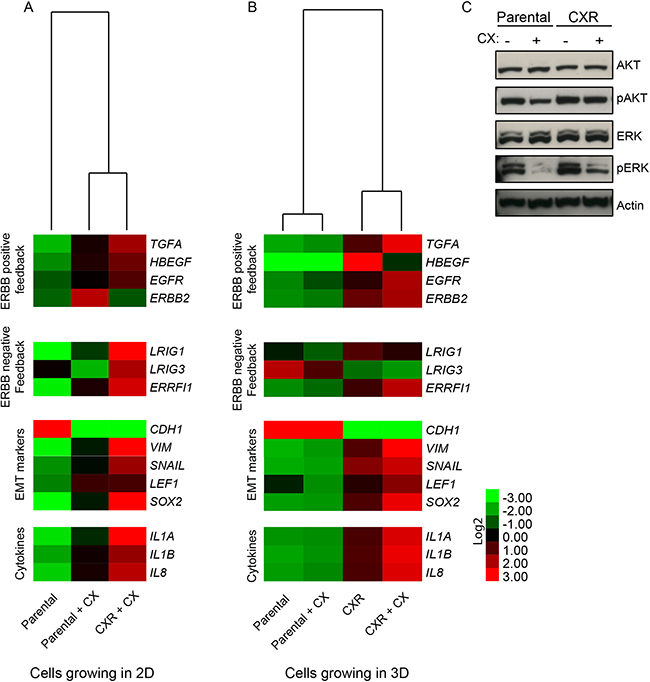 Figure 3: Gene expression analysis of parental and CXR cells. A-B. PCR analysis of parental or cetuximab resistant (CXR) cells growing as monolayer (A) or as spheroids (B) were collected, both under CX (2μg/ml) treatment or regular medium conditions. A set of genes probing EGFR positive/negative feedback loop, EMT phenotype and inflammatory cytokines were analysed and displayed as heatmap. C. Western blot analysis of phospho-AKT (pAKT), AKT, phospho-ERK (pERK) and ERK levels in Caco-2 parental and CXR cells treated over-night with and without cetuximab. Actin served as a loading control.