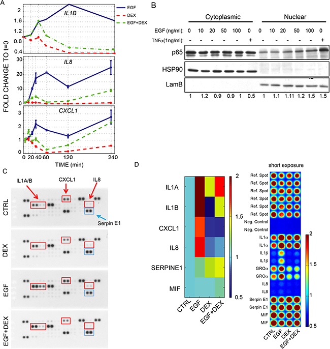 Figure 4: EGFR activation controls the production of a module of inflammatory cytokines in MCF10A. A. Expression levels of the module of inflammatory cytokines (IL1B and IL8 and CXCL1) analysed by Real-Time PCR in MCF10A following EGF (10ng/ml) or DEX (100nM) administration, alone or in combination, over a time course of 4h; B. Western blot of NF-kB in cytoplasmic and nuclear fraction of MCF10A cells following administration of increasing doses of EGF (from 1 to 100ng/ml). TNFα (1ng/ml) treatment was used as positive control for NF-kB (p65) activation and nuclear translocation. Laminin B and HSP90 were used as loading control for the nuclear and cytosolic fraction, respectively; C-D. Cytokine array of MCF10A cells following administration of EGF (10ng/ml), DEX (100nM), alone or in combination. Representative pictures are provided in C. Quantification of chemioluminescence along with images of normalized spots are provided in D.