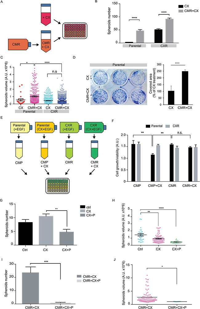 Figure 5: Secreted factors from CX resistant cells reduces cetuximab sensitivity on parental cells. A. Schematic diagram showing the modality of obtaining conditioned medium from CXR cells (CMR), which was subsequently used for treatments. CMR was collected from CXR Caco2 cells cultured for 72h in presence of cetuximab (2 μg/ml); B-C. Spheroid assay of parental and CXR cells cultured in fresh medium or CMR, both supplemented with EGF (10 ng/ml) and cetuximab (2 μg/ml). Pictures at 4x magnification of at least four not overlapping fields were taken after 10 days and spheroids number and volume were measured. Quantification of spheroids number (mean ± s.e.m) is provided in B. Quantification of volume of each spheroid and the mean value for each treatment is provided in C. * p< 0.05 **** p< 0.0001, n.s.: not significant (two-way ANOVA); D. Colony formation assay of parental cells seeded with fresh medium or conditioned medium from CXR cells (CMR), both supplemented with Cetuximab (2 μg/ml). Representative images of crystal violet staining are provided in the left panel. Quantification of the relative covered area, displayed as percentage of conditioned medium treatment (mean ± s.e.m), is provided in the right panel. p<0.00026 (t-test). E. Scheme depicting the second modality of conditioned media production from Parental or CXR Caco-2 cells. In these settings the conditioned media was collected from parental and CXR cells cultured for 72 hours in full medium supplemented with EGF (10 ng/ml) alone or in combination with cetuximab (2 μg/ml); F. Parental and CXR cells were treated with the conditioned medium obtained as described in E. Cell growth/viability was measured with Alamar blue assay after 96 hours (in the graph mean ± s.e.m, arbitrary unit). ** p<0.01, n.s.: not significant (two-way ANOVA). G-H. Spheroid assay of parental cells cultured in fresh medium, supplemented with EGF (10 ng/ml) and cetuximab (2 μg/ml) plus parthenolide (1μM). Pictures at 4x magnification of at least four not overlapping fields were taken after 10 days and spheroids number and volume were measured. Quantification of spheroids number (mean ± s.e.m) is provided in G. Quantification of spheroid volumes along with the mean value for each treatment is provided in H. ** p< 0.01 **** p< 0.0001 (one -way ANOVA); I-J. Spheroid assay of parental cells cultured in fresh medium, or conditioned medium from CXR cells (CMR) supplemented with EGF (10 ng/ml) and cetuximab (2 μg/ml), alone or in combination with parthenolide (10 μM). Pictures at 4x magnification of at least four not overlapping fields were taken after 10 days and spheroids number and volume were measured. Quantification of spheroids number (mean ± s.e.m) and volumes is provided in I and J, respectively. * p< 0.05 ** p< 0.01 **** p< 0.0001 (one -way ANOVA).