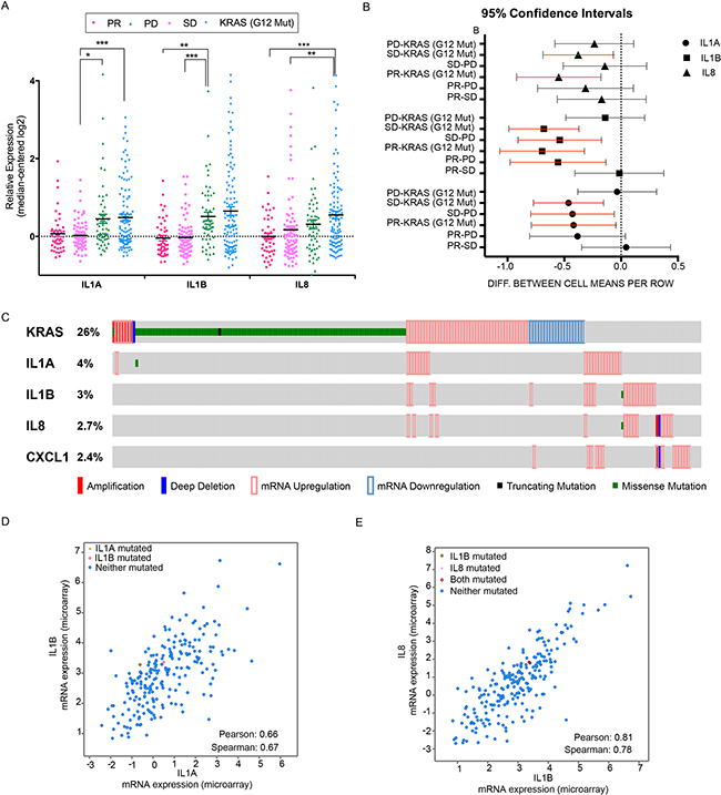 Figure 6: A panel of inflammatory cytokines correlates with cetuximab response in colorectal patients. A. Expression analysis of IL1A, IL1B and IL8 in colorectal quadruple wild type (wild type for KRAS, BRAF, NRAS and PIK3CA) tumors, subdivided by response to Cetuximab therapy: disease regression (PR), disease stabilization (SD), disease progression (PD). The KRAS (G12 Mut) group was included as control for lack of response to CX; B. Forest plot summarizing the differences between the indicated groups in the data set of colon cancer patients. Each line represents the 95% confidence interval corresponding to the listed comparisons. Note that the red lines indicate statistical significance; C. RNAseq data of colon cancer samples from TCGA Colorectal Adenocarcinoma (631 samples from 627 patients). D-E. Co-expression analysis from TGCA datasets, of IL1A and IL1B (D) and of IL8 and IL1B (E). Statistically significant values were computed and Pearson and Spearman correlation values are provided.