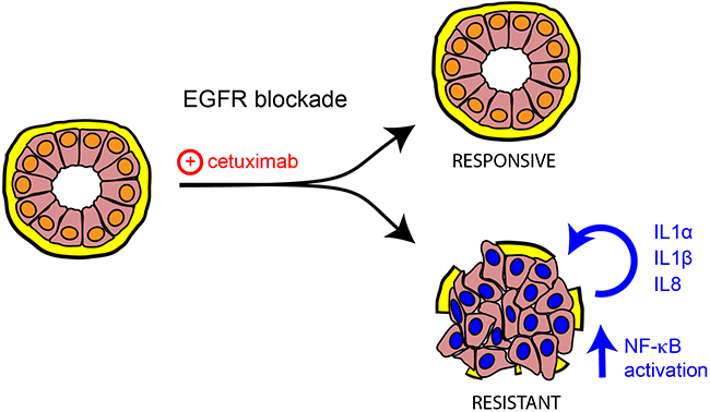 Figure 7: Model depicting the link between the unveiled inflammatory cytokines and resistance to cetuximab. Schematic diagram showing a new mechanism of resistance to cetuximab in colorectal cancer, relying on autocrine or paracrine production and secretion of the inflammatory cytokines IL1A, IL1B and IL8. Under EGFR targeting, colorectal tumors might display rewiring of cell signalling with consequent undifferentiated phenotype and activation of the indicated cytokines along with NF-kB signalling.