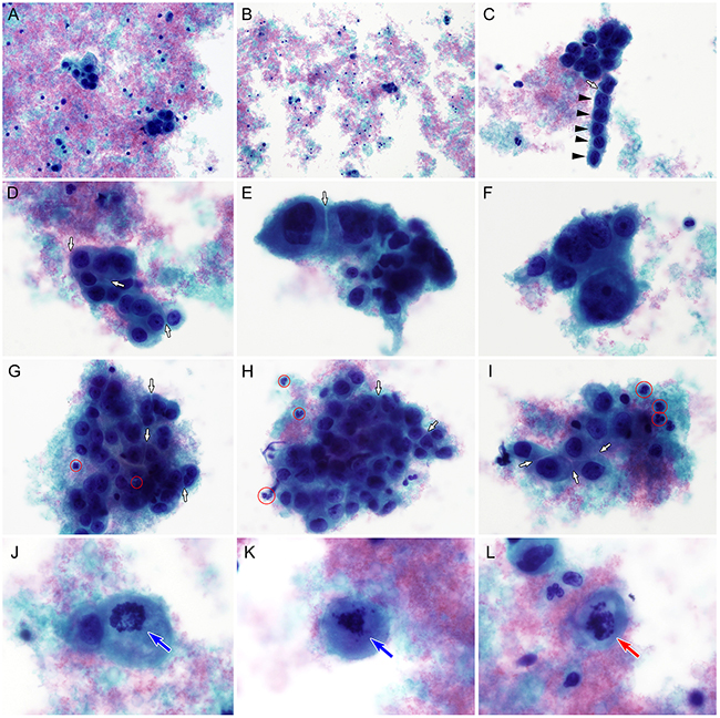 Figure 1: Liquid-based cytological findings of cervical glassy cell carcinoma. A. Thinprep preparation of the cervical sample shows amphophilic, granular necrotic debris (tumor diathesis) and a few small clusters of polygonal tumor cells. B. The tumor cell clusters or individually scattered tumor cells are unevenly distributed. Tumor diathesis is apparent. C. Although some tumor cells display endocervical-like pseudocolumnar arrangements (black arrowheads), there is no definite evidence of glandular differentiation. A white arrow indicates the intercellular window. D. The tumor cells have relatively fine chromatin and prominent, solitary nucleoli. Abundant, cyanophilic cytoplasm and discrete cell borders (white arrows) are evident. E. Under high-power magnification (×400), the tumor cells show large, oval to round, pleomorphic nuclei and “intercellular windows” produced by discrete cytoplasmic outlines and cytoplasmic molding (white arrow). There are no intercellular bridges. F. Tumor cells are 3–7 fold larger than lymphocytes or neutrophils. Chromatin distribution irregularities, hyperchromasia, and significant anisonucleosis are apparent. G-I. In several areas, an intimate admixture of neutrophils (red circles) and tumor cells, so-called granuloepithelial complexes, is seen. Cytoplasmic molding and intercellular windows (white arrows) are observed. J-K. Mitotic figures (blue arrows) are present. L. Atypical mitotic figures (red arrow) are also detected (A-L, Papanicolaou stain).