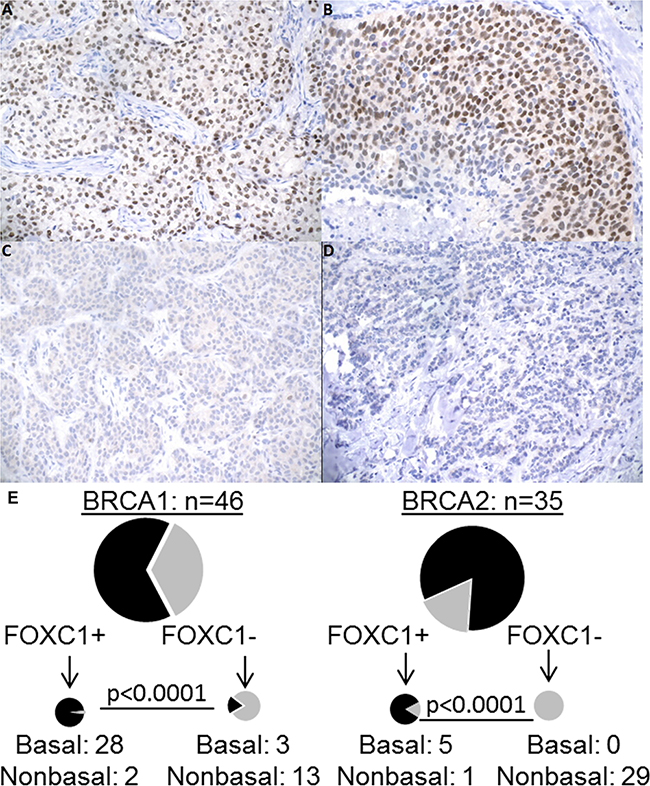 Figure 1: FOXC1 immunohistochemistry, BRCA1/2 mutation status, and molecular subtype. A. BRCA1 mutant, basal molecular subtype with positive nuclear staining. B. BRCA wild-type, basal molecular subtype with strong nuclear positivity. C. BRCA2 mutant, luminal A molecular subtype with negative staining. D. BRCA wild-type, luminal A molecular subtype with negative staining. All images 200X. E. Distribution of BLBC/NonBLBC among FOXC1 IHC positive or negative cells for BRCA1 mutant and BRCA2 mutant tumors. BLCB: Basal-like breast cancer. NonBLBC: Non basal-like breast cancer, including Her2+ and Luminal A and Luminal B tumors.