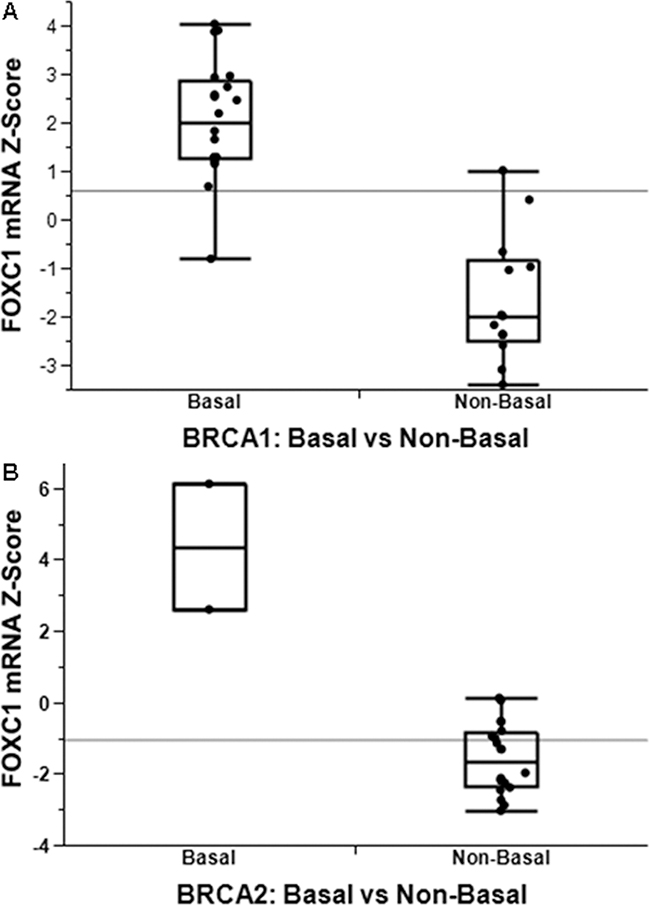 Figure 2: FOXC1 associated with BLBC with functional significance. FOXC1 mRNA is significantly higher in basal-like breast cancer in both patients with both BRCA1 A. and BRCA2 B. mutations.