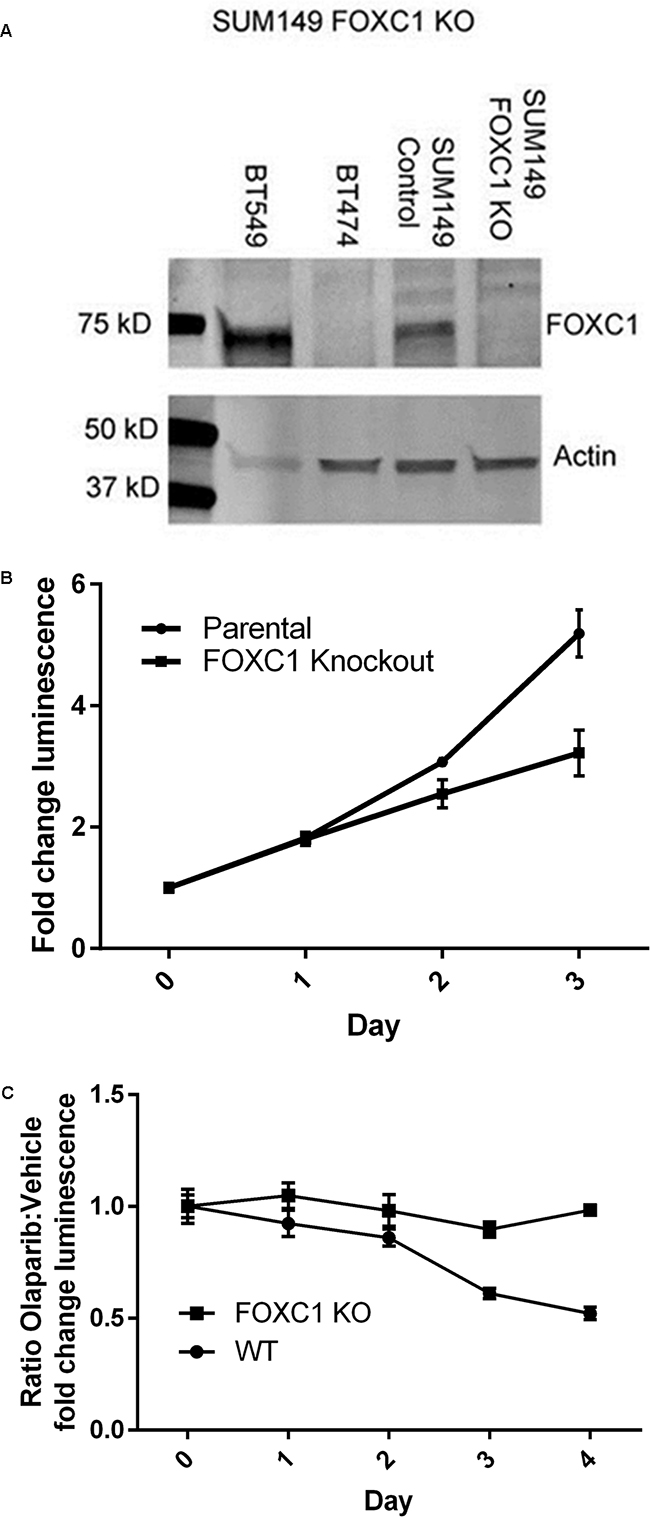 Figure 3: FOXC1 knockdown diminishes proliferation. A. Western blot demonstrating CRISPR knockout of FOXC1 in SUM149. High-FOXC1 BLBC cell line BT549 and low-FOXC1 luminal cell line BT474 used as qualitative controls. B. FOXC1 knockdown results in diminished proliferation compared to FOXC1 wildtype in SUM149 cells. Mean ±SD for representative experiment with 6 technical replicates. Statistical significance for the difference in fold-change luminescence between parental and knockout cells, p<0.01 calculated by Mann-Whitney U test, reached on day 2 of growth. C. SUM149 FOXC1 wild-type cells are more sensitive to olaparib than FOXC1 knockout cells. Ratio of means ± combined SD for p<0.01 calculated by Mann-Whitney U test reached on day 3 of treatment.