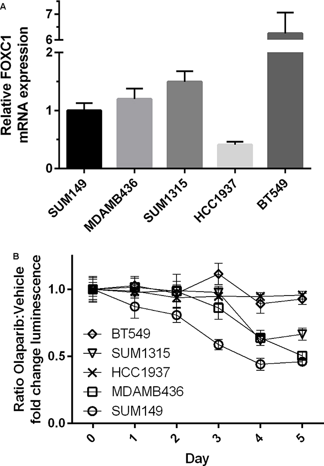 Figure 4: BRCA1-mutant cell line intrinsic FOXC1 level associated with PARPi sensitivity. A. Relative FOXC1 mRNA expression for BRCA1-mutant cell lines and BRCA1 wild-type basal-like cell line BT549. Note Y-axis has been truncated for BT549 expression. BT549 FOXC1 expression significantly greater than all other cell lines (p<0.0001). HCC1937 FOXC1 expression significantly less than all other cell lines (p<0.01). B. Sensitivity of BRCA1 mutant cell lines and BT549 to olaparib. Ratio of means ± combined SD. p<0.01 calculated by Mann-Whitney U test reached on day 3 of treatment.