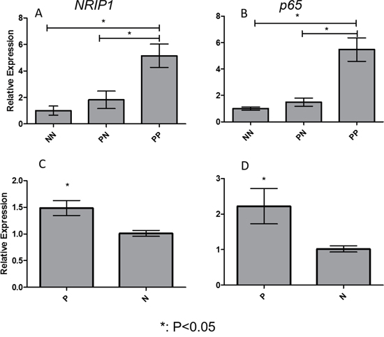 Figure 1: Expression of NRIP1 and p65 was elevated in lesions and PBMCs of psoriasis patients. Expression of NRIP1 mRNA A. and p65 mRNA B. was significantly increased in PP compared to PN and NN, respectively (p<0.05). In PBMCs, the expression of NRIP1 mRNA C. and p65 mRNA D. was remarkably elevated in psoriasis patients (p<0.05). PP: psoriatic lesions, PN: psoriatic non-lesions, NN: healthy controls, P: psoriasis patients, N: Normal persons