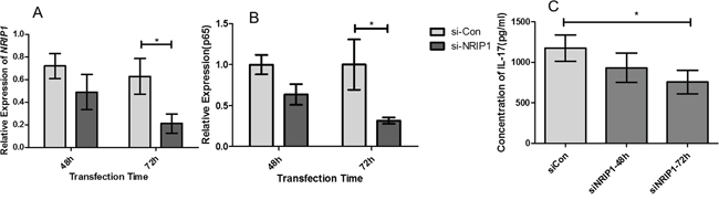 Figure 3: Suppression of NRIP1 reduced expression of p65 and decreased secretion of IL-17 in CD4+T cells. QRT-PCR assay showed that the expression of NRIP1 mRNA A. and p65 mRNA B. in CD4+T cells were reduced significantly at 72h after siNRIP1 treatment (P<0.05). ELISA assay C. showed siNRIP1 transfection decreased the concentration of IL-17 in the supernatants of CD4+T cells at 72h after siNRIP1 treatment (p<0.05).