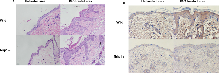 In order to detect the function of Nrip1 deficiency on NF-κB during IMQ treatment, IHC staining was used to detect the expression of p65 in skin sections from WT and Nrip1-/- mice, both in IMQ treated and untreated area. The p65 stained sections were digitally imaged. The IHC results (Figure 5B) showed that compared to WT mice, p65 positive cells within IMQ treated skin were decreased in epidermis and dermis of Nrip1-/- mice, respectively.