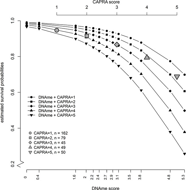 Figure 2: Estimated absolute risk values from a Cox model with combined risk score as predictors (black symbols) show that a patient with any given CAPRA score would be likely to get a more accurate risk stratification depending on the level of methylation (DNAme) of the six genes in the methylation score. The gray symbols show the estimated survival probabilities from a univariate Cox model if CAPRA score alone is used as a predictor.