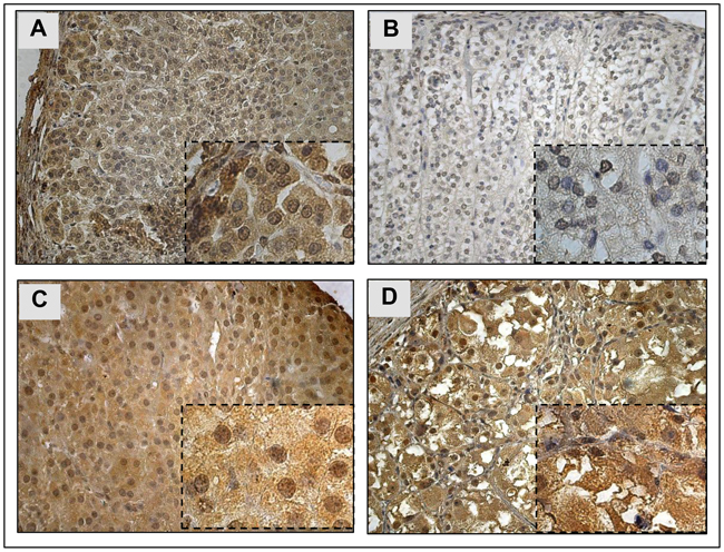 Figure 1: YAP1 protein* expression and localization in normal adrenal cortex and pediatric ACT. A. YAP1 cytoplasmic and nuclear staining in normal fetal adrenal. B. Weak YAP1 staining in normal post-natal adrenal cortex. C. YAP1 cytoplasmic and nuclear staining in pediatric ACT. D. YAP1 cytoplasmic staining in pediatric ACT. * Mouse anti-YAP1 antibody, dilution 1:50, ab56701, Abcam. Magnification: 400x and 1000x.