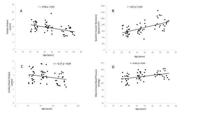 Figure 2: Relationship between age and maximum cardiac output (A), maximum systemic vascular resistance (B), maximum cardiac power output (C), maximum mean arterial pressure (D)