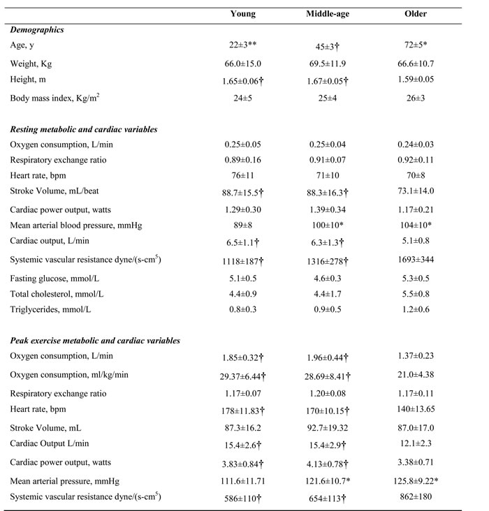 *significant difference from young (p<0.05) **significant difference from middle (p<0.05) †significant difference from old (P<0.05)