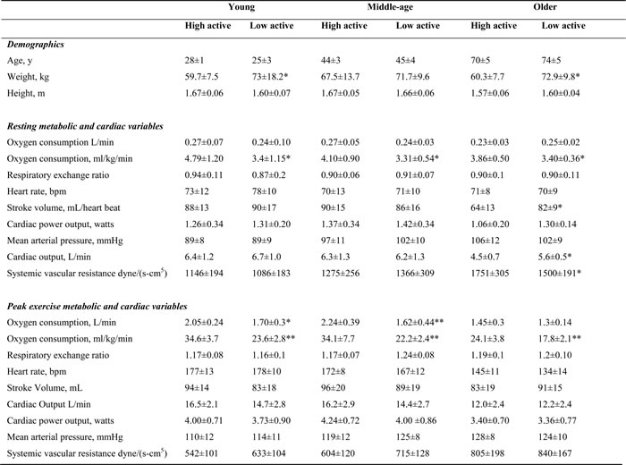 Table 3: Participant characteristics, resting and peak exercise cardiac and metabolic variables stratified by age and physical activity